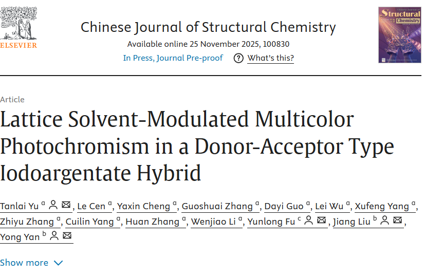近日,我所于探来博士团队的研究论文《Lattice Solvent-Modulated Multicolor Photochromism in a Donor-Acceptor Type Iodoargentate Hybrid》在权威学术期刊《Chinese Journal of Structural Chemistry》在线发表。于探来博士为该论文的第一作者兼通讯作者,我校为第一完成单位,我校多名师生参与了本论文的研究工作。