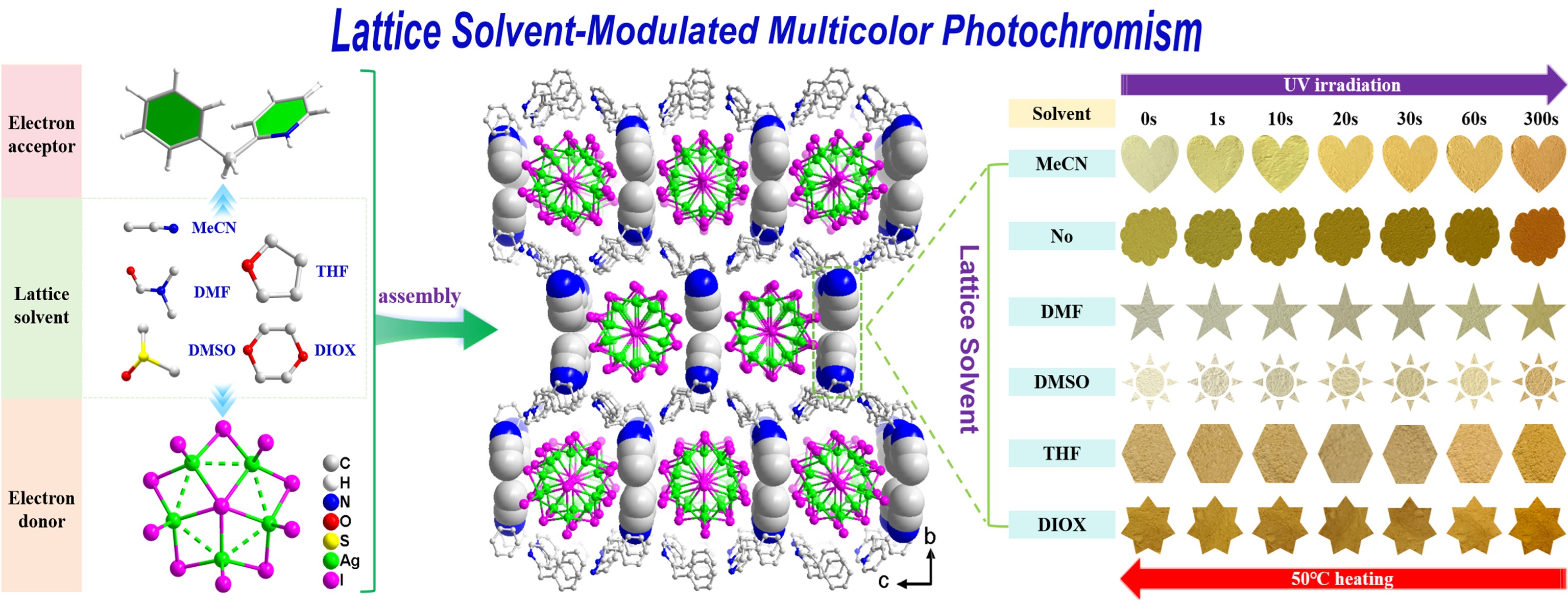 论文摘要:基于电子供体-受体(EDA)体系的可逆多色光致变色材料因其在显示、无墨可擦写印刷及防伪领域的潜在应用,近期备受关注。然而,利用同一EDA体系实现多色光致变色仍极具挑战性。本文通过溶液蒸发法,在室温下合成了一种新型EDA碘银酸盐杂化物:[(2-Bz-pyH)(Ag5I6)]·MeCN (1)(2-Bz-pyH+ = N-质子化2-苄基吡啶嗡盐阳离子,MeCN = 乙腈)。值得注意的是,在365 nm汞灯照射下,化合物1及其脱乙腈溶剂的样品(标记为1-H)展现出晶格溶剂调控的多色光致变色性能(1呈现淡黄色至棕色,1-H呈现黄色至红棕色)和快的响应时间(1秒内)。此外,1-H分别用DMF/DMSO/THF/DIOX蒸汽熏蒸,这些样品在相同的光照条件下也表现出不同的光致变色特性。通过实验与理论研究的结合,提出了基于相互分子间电荷转移耦合光解碘银酸盐骨架的新光致变色机制。这些结果为使用晶格溶剂调控相同EDA体系,设计多色光致变色材料提供了新的思路。